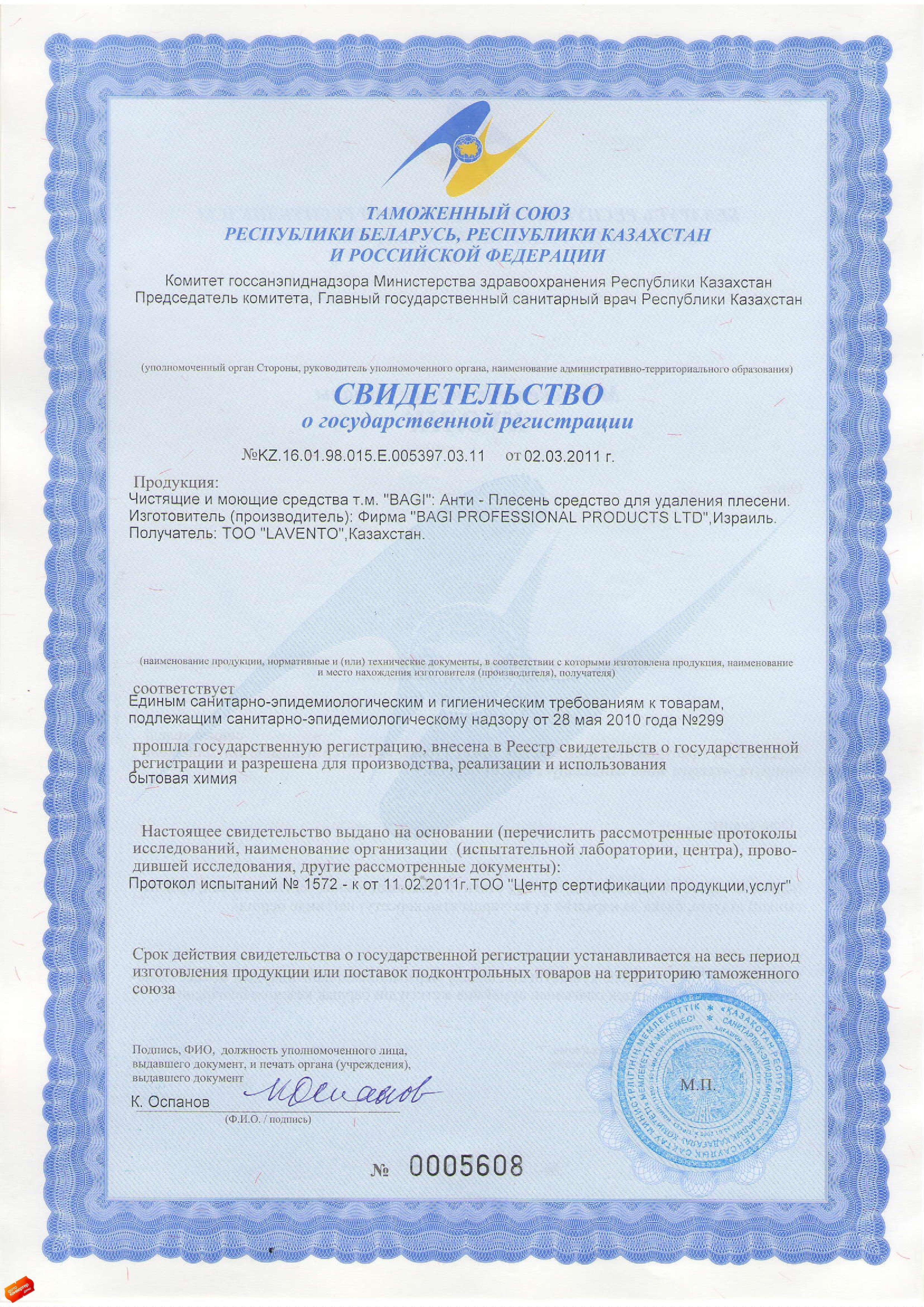 Сертификат на товар - Средство для сантехники против плесени и грибка Bagi Анти-плесень 500 мл