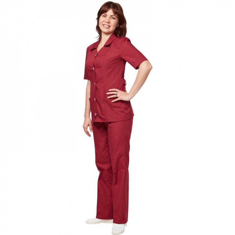 Женский костюм для сферы обслуживания У12 на пуговицах. Рукав короткий. Для изготовления женского костюма использована ткань Ти-Си бордового цвета, плотностью 120 г/кв. м, имеющая в составе 35% хлопка и 65% полиэфира. Размер: 44-46, рост: 158-164.