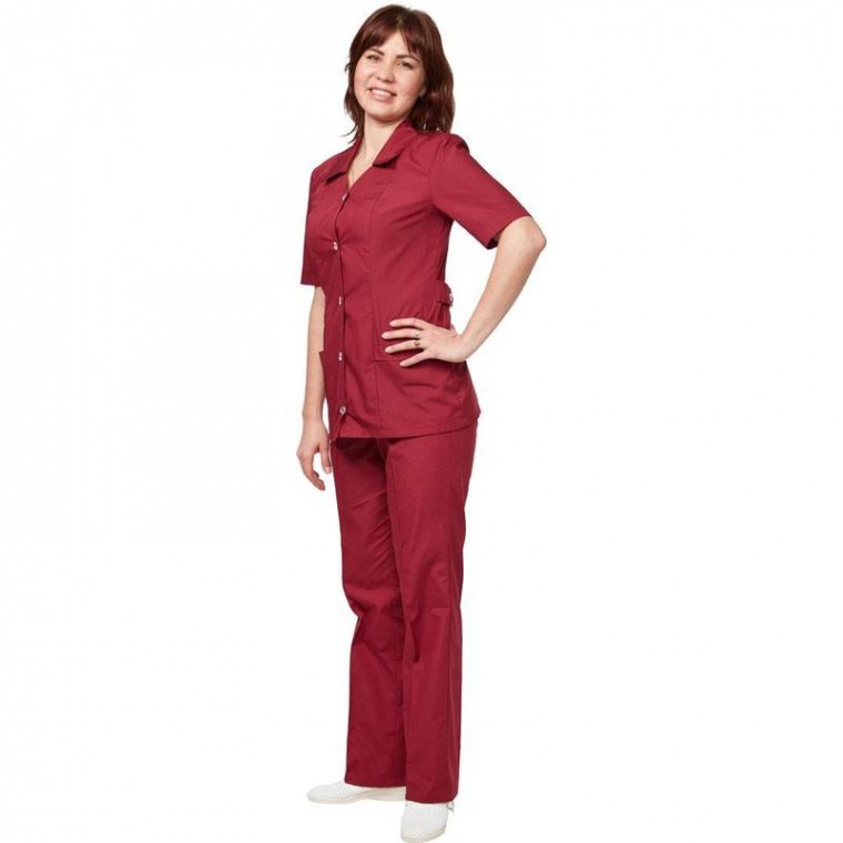 Женский костюм для сферы обслуживания У12 на пуговицах. Рукав короткий. Для изготовления женского костюма использована ткань Ти-Си бордового цвета, плотностью 120 г/кв. м, имеющая в составе 35% хлопка и 65% полиэфира. Размер: 52-54, рост: 158-164.