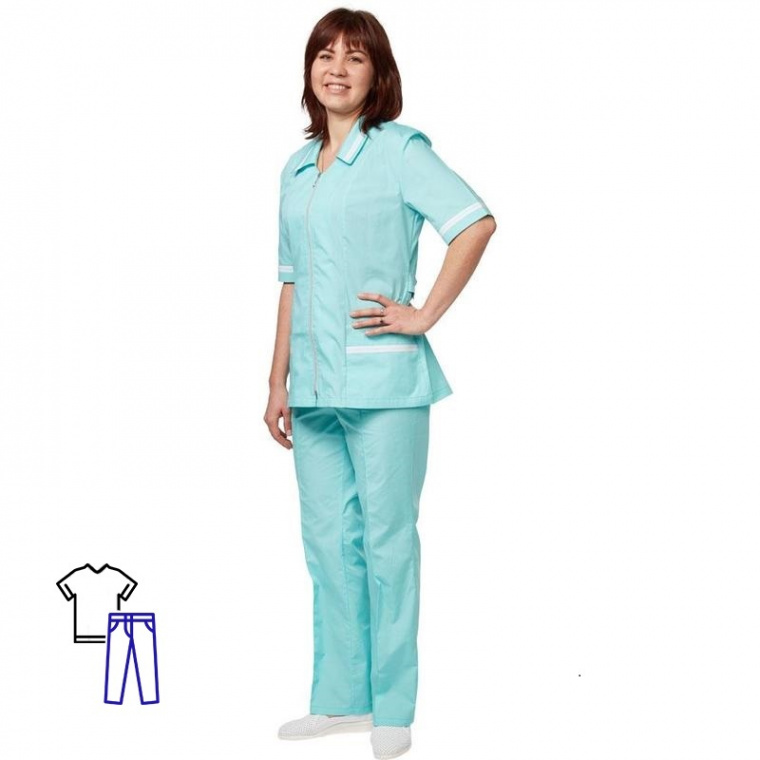 Блуза — Приталенная с рельефными швами на полочке и спинке, имеет 2 накладных кармана втачиваемых в боковой и рельефный шов, с застежкой на молнии, с короткими рукавами и отложным воротником. По линии талии на спинке имеется регулируемый пояс на пуговицах. Манжеты рукавов, карманы, воротник имеют декоративную ленту. Брюки — прямые, на резинке, с застроченной стрелкой спереди, боковым накладным карманом, втачиваемым в боковой шов.