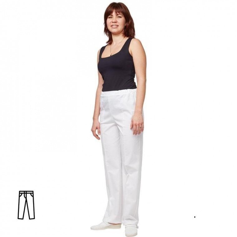 Брюки универсальные прямого кроя с поясом на эластичной ленте. Стрелки расположены спереди. На правой передней полочке брюк один накладной карман. Плотность ткани — 115-120 г/кв.м. Рекомендована стирка при температуре не выше 40 градусов.