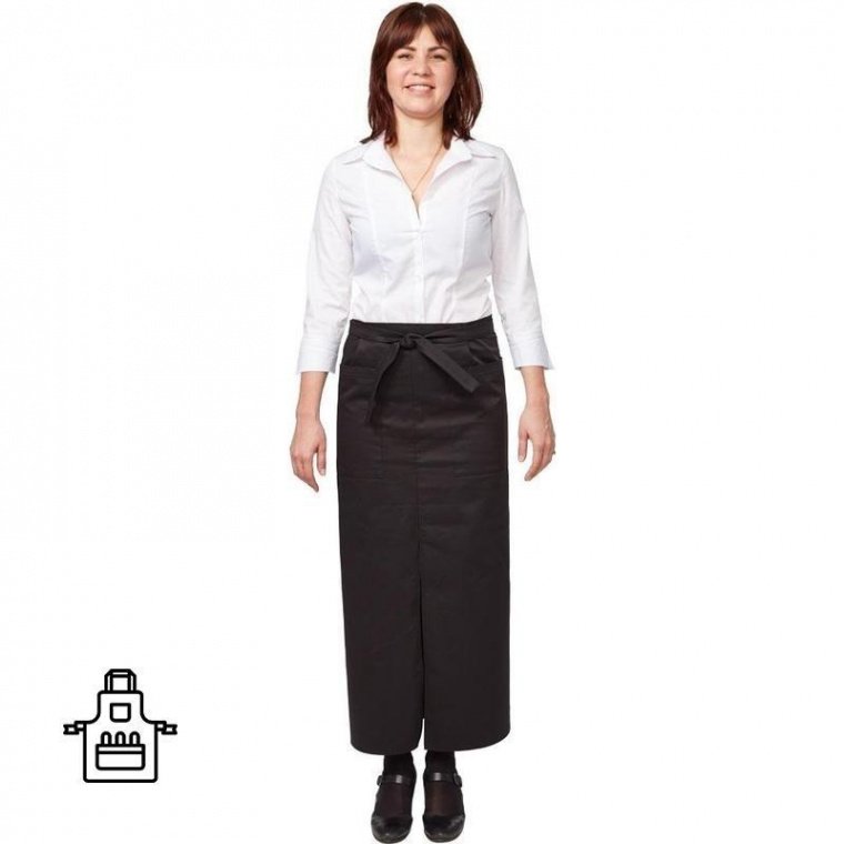 Фартук официанта длинный изготовлен из ткани форвард (состав: 65% полиэстер + 35% хлопок), плотностью 240 г/кв.м. Завязывается по талии поясом. С разрезом спереди и двумя накладными карманами.