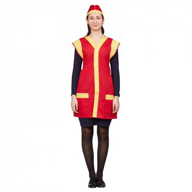 Фартук-сарафан «Солнышко» всеразмерный. Изготовлен из ткани «Ти-Си» красного цвета плотностью 120 г/кв.м, состоящей из хлопка (35%) и полиэфира (65%). Желтая отделка. Фартук оснащен накладными карманами и регулирующим талию хлястиком, поставляется в комплекте с пилоткой.