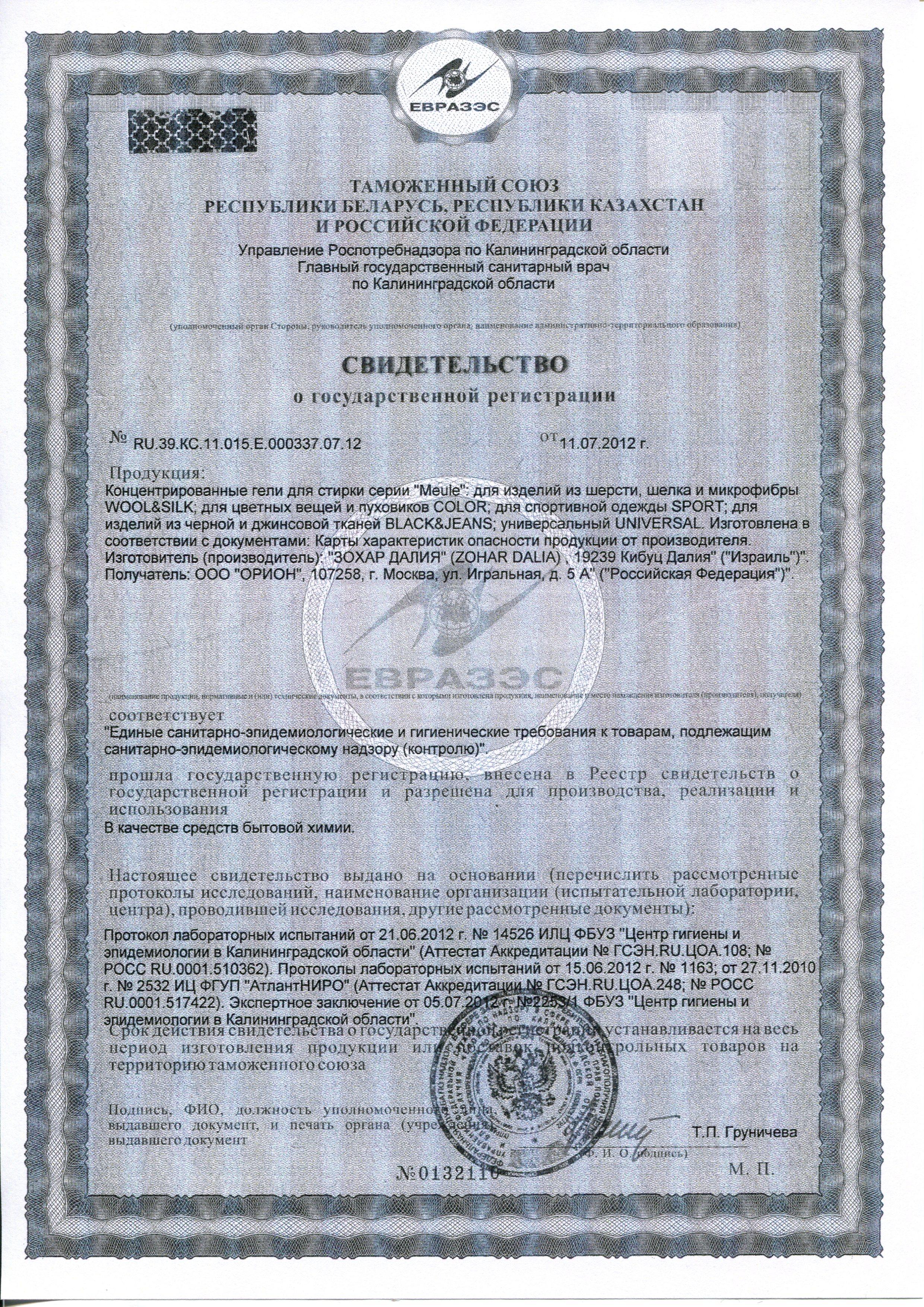 Сертификат на товар - Гель для стирки универсальный Meule Universal 1 л