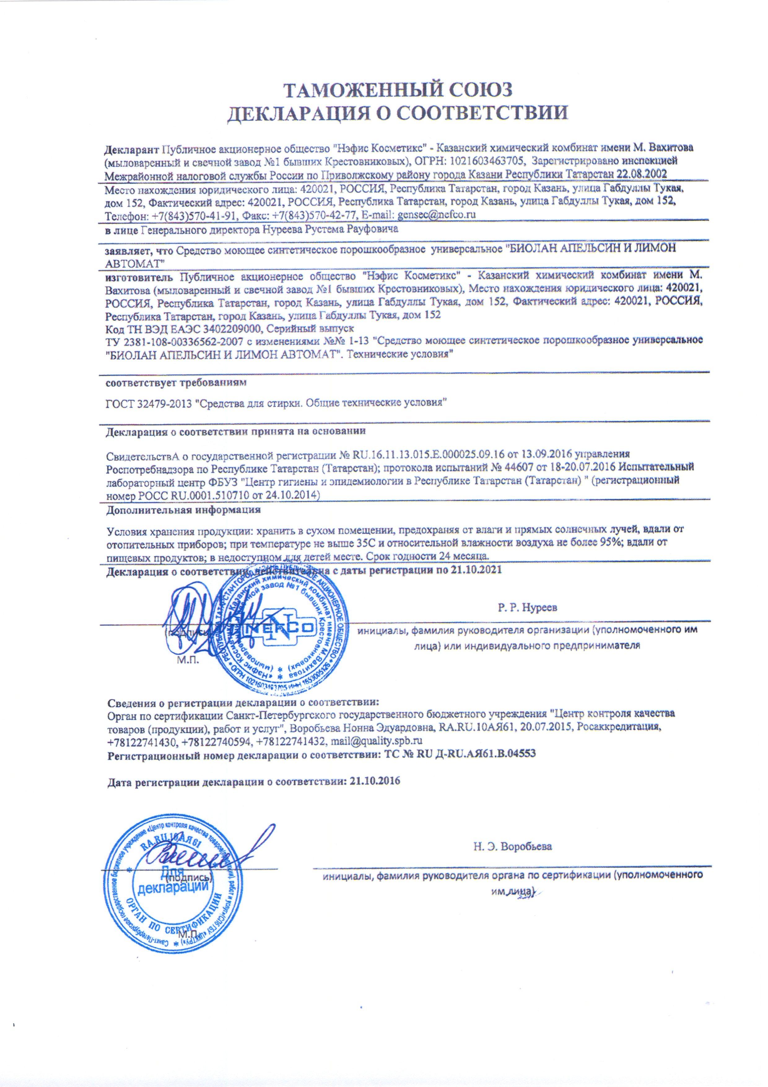 Порошок стиральный синтетический универсальный с пониженным пенообразованием с био компонентами и перекисными солями. Предназначен для замачивания, стирки и отбеливания изделий из хлопчатобумажных, льняных, синтетических тканей, а также тканей из смешанных волокон в стиральных машинах любого типа и ручной стирки. Порошок не предназначен для стирки изделий из шерсти и натурального шелка.