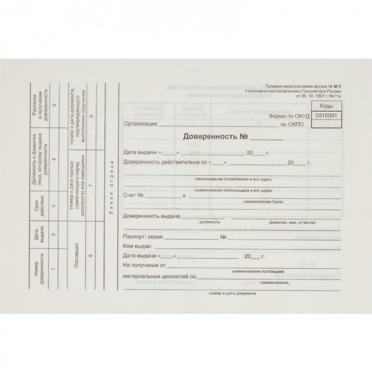 Бухгалтерские бланки — доверенность, типовая форма М-2. Удостоверяют право сотрудника организации получать материальные ценности по договору, заказу, наряду, соглашению, счету. Бланки отпечатаны на офсетной бумаге формата А5. В комплекте 100 штук, склеенных в виде книжки. Упакованы в термоусадочную пленку.
