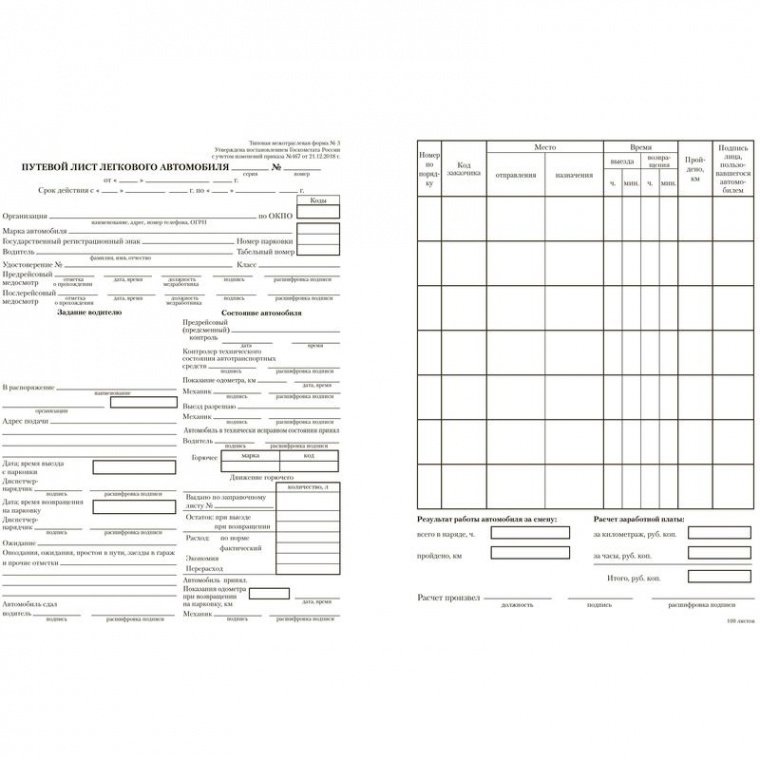 Бухгалтерские бланки — путевой лист легкового автомобиля, типовая межотраслевая форма №3. Применяются в процессе организации перевозок грузов и пассажиров. Бланки отпечатаны на офсетной бумаге формата А5. В комплекте 100 штук, склеенных в виде книжки. Упакованы в термоусадочную пленку.