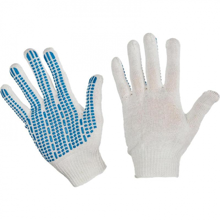 Универсальные рабочие перчатки хб с ПВХ защищают руки от мелких механических повреждений и общих производственных загрязнений во время ремонтных и строительных работ, обеспечивают надежное сцепление с инструментом. Рабочие трикотажные перчатки изготовлены из плотной хлопчатобумажной ткани, имеют долговечное покрытие из ПВХ синего цвета. Покрытие ПВХ (протектор) помогает обеспечить плотный захват и предотвращают соскальзывание детали. Оптимальны для складских, погрузочно-разгрузочных, садовых и ремонтных работ. Положите их в автомобиль и, в случае необходимости, вы защитите свои руки от травм и грязи. Материал и рисунок покрытия: ПВХ, протектор. Вес одной пары — 44 г. Класс вязки: 10. Длина перчаток от манжеты до кончика среднего пальца — 22-23 см. Количество пар в упаковке: 10.