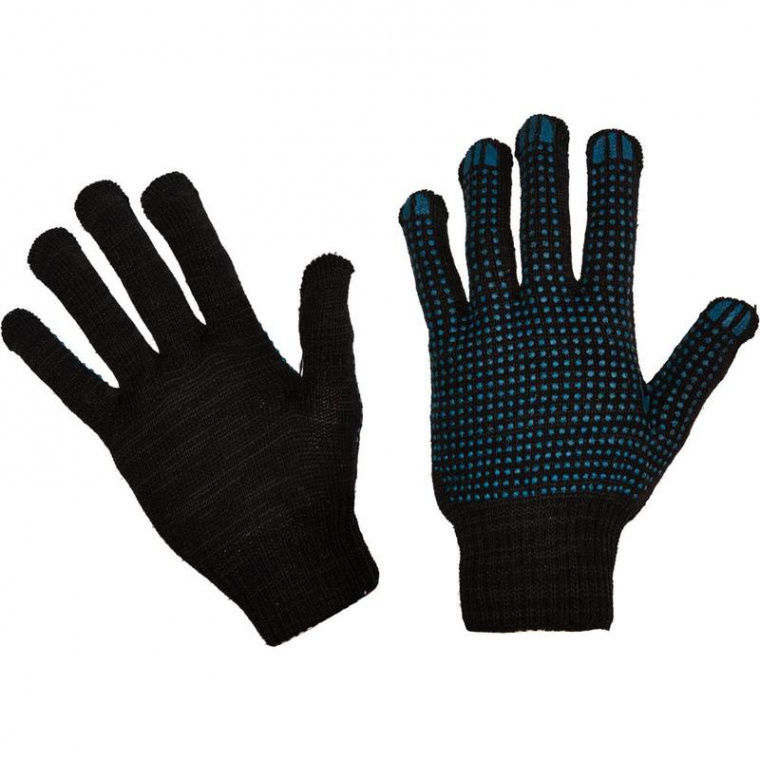 Универсальные рабочие перчатки хб ПВХ черного цвета предназначены для защиты рук от мелких механических повреждений и общих производственных загрязнений. Рабочие перчатки изготовлены из хлопчатобумажной пряжи с покрытием точка из поливинилхлорида с нанесением рисунка на внутреннюю сторону перчатки. Покрытие ПВХ помогает обеспечить плотный захват и предотвращают соскальзывание детали. Перчатки трикотажные безразмерные с манжетой на резинке обеспечивают плотное прилегание перчатки к руке. Оптимальны для складских, садовых и ремонтных работ. Положите их в автомобиль и, в случае необходимости, вы защитите свои руки от травм и грязи. Основа: 80% хлопок, 20% полиэфир; вес пряжи — 116 текс. Материал и рисунок покрытия: ПВХ, точка. Количество пар в упаковке: 10.