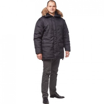 Спецодежда зимняя куртка мужская 'Аляска' (размер 52-54, рост 182-188) черного цвета. Изготовлена из ткани 'Оксфорд' (100% полиэстер), плотность ткани - 110 г/кв.м. Утеплитель - синтепон, плотность - 200 г/кв.м (2 слоя). Материал подкладки - 100% полиэстер. Куртка удлиненная с центральной застежкой на молнию, ветрозащитным клапаном, два нижних накладных и два потайных верхних плюс внутренний карман, низ куртки регулируется кулиской, капюшон с искусственным мехом (не отстегивается). Куртка обеспечивает защиту от пониженных температур и производственных загрязнений. Рекомендована для использования в логистике, легкой промышленности, строительстве. ГОСТ 12.4.236.2011. В коллекции зимней спецодежды з28 представлены кутрки-аляски з28-КУ красного, синего и черного цветов. К этим курткам подходят брюки з28-БР из этой же коллекции.