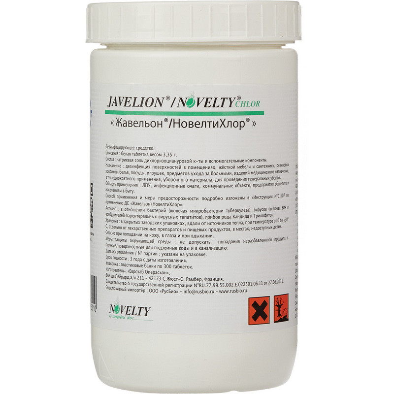 Хлорные таблетки 'Жавельон'. Предназначены для дезинфекции поверхностей в помещениях, жесткой мебели, санитарно-технического оборудования, резиновых ковриков, посуды, игрушек, предметов ухода за больными, изделий медицинского назначения, в том числе однократного применения, белья, уборочного инвентаря при инфекциях бактериальной (включая туберкулез), вирусной и грибковой (кандидозы, дерматофитии) этиологии в ЛПУ, инфекционных очагах, на коммунальных объектах, предприятиях общественного питания; для заключительной дезинфекции в детских учреждениях, для проведения генеральных уборок, а также для дезинфекции населением в быту (в соответствии с этикеткой для быта). Активное вещество: натриевая соль дихлоризоциануровой кислоты. Применение дезинфицирующего средства: рабочие растворы готовят в стеклянных, эмалированных или пластмассовых емкостях путем растворения определенного числа таблеток в воде. Предметы ухода за больными и изделия медицинского назначения полностью погружают в дезинфицирующий раствор. Разъемные изделия обрабатывают в разобранном виде, каналы и полости заполняют раствором. После дезинфекции их промывают проточной водой в течение 3 минут. Посуду освобождают от остатков пищи и полностью погружают в дезинфицирующий раствор. По окончании дезинфекции посуду промывают водой в течение 3 минут. Игрушки (пластмассовые, резиновые, металлические) погружают в раствор в емкость с крышкой, препятствуя их всплытию. Крупные игрушки протирают ветошью, смоченной раствором. По окончании дезинфекции игрушки промывают водой в течение 5 минут. Белье (кроме шерстяного и синтетического) последовательно замачивают в растворе. По окончании дезинфекции белье стирают и прополаскивают. Предметы обстановки, пол, стены протирают ветошью или орошают раствором. После окончания дезинфекции помещение проветривают в течение 15 минут, паркетный пол, полированную и деревянную мебель протирают сухой тканевой салфеткой. Санитарно-техническое оборудование протирают или орошают раствором средства. Уборочный материал замачивают в растворе дезинфицирующего средства. По окончании дезинфекции - прополаскивают.