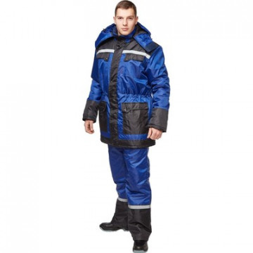 Спецодежда зимняя костюм мужской з27-КПК состоит из куртки и полукомбинезона (размер 60-62, рост 170-176) синего цвета с черными вставками. Изготовлен из ткани Оксфорд с водоотталкивающей пропиткой (100% полиэстер), плотность ткани - 110 г/кв.м. Утеплитель - синтепон, плотность утеплителя куртки - 120 г/кв.м (3 слоя), полукомбинезона - 120 г/кв.м (2 слоя). Материал подкладки - 100% полиэстер. Светоотражающая полоса размещена на груди, спине, а также внизу полукомбинезона. Куртка с центральной застежкой на молнию, ветрозащитным клапаном, съемным утепленным капюшоном, нижними и верхними накладными карманами, воротник куртки изнутри отделан флисом, трикотажные напульсники, ширина талии регулируется кулиской. Полукомбинезон классического покроя с двумя нижними накладными карманами и одним верхним. Костюм обеспечивает защиту от пониженных температур и производственных загрязнений. ГОСТ 12. 4. 303-2016. Внимание! Нанесение логотипа методом термопереноса для данного типа ткани не рекомендуется.Костюмы, состоящие из куртки и полукомбинезона, из коллекции зимней спецодежды з27 представлены в нескольких цветовых сочетаниях: серый с контрастной отделкой черного цвета и синий, с аналогичной черной отделкой.