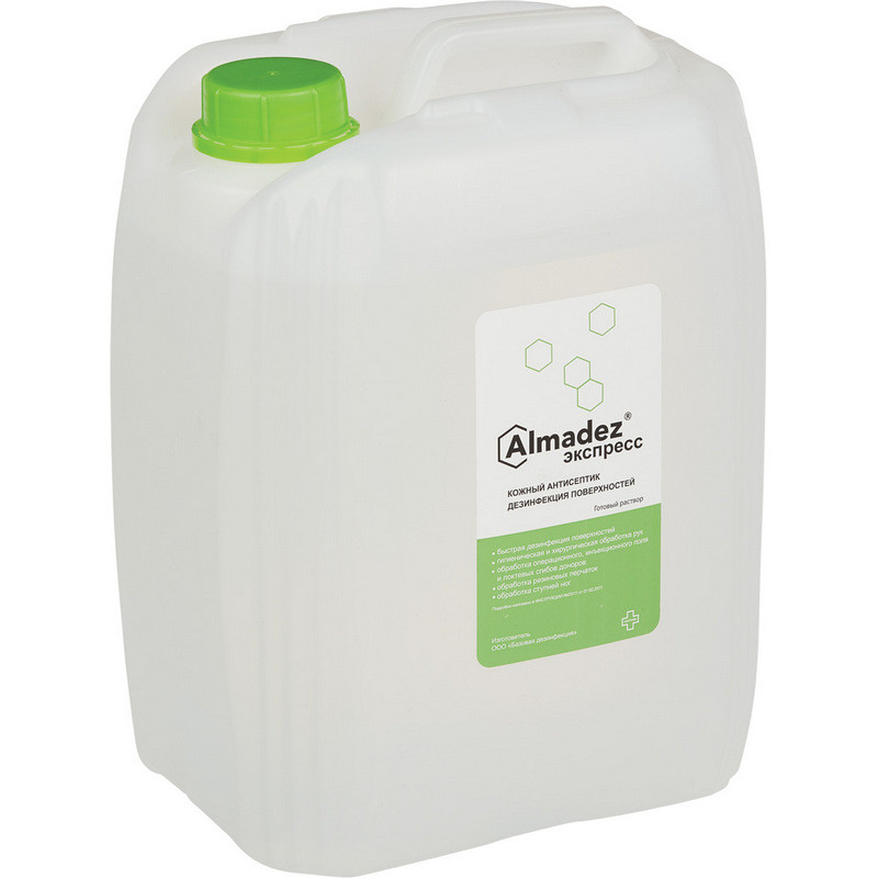 Антисептик кожный спрей 'Алмадез Экспресс' спиртовой 5 л. Химический состав средства: ЧАС, спирты, вспомогательные компоненты. Действующие вещества: алкилдиметилбензиламмоний хлорид (АДБАХ) 0.1 %, изопропиловый спирт (пропанол-2) 63.5 %, вспомогательные компоненты. Сфера применения: акушерские стационары, ЛПУ, клинические лаборатории, бактериологические лаборатории, детские учреждения (детсады, школы и т.п.), пенитенциарные учреждения, предприятия общественного питания, предприятия продовольственной торговли, потребительские рынки, коммунальные объекты (бани, бассейны, гостиницы, общественные туалеты и т.п.), учреждения соцобеспечения, парикмахерские, санитарный транспорт, отделения неонатологии, в быту населением, предприятия фармацевтической промышленности, аптеки, учреждения культуры, отдыха (кинотеатры, музеи, театры), спортивные и культурно-оздоровительные комплексы, объекты курортологии, вирусологические лаборатории. Объекты обработки: гигиеническая обработка рук, обработка инъекционного поля, обработка кожи ног для профилактики грибковой инфекции, обработка локтевых сгибов доноров, обработка операционного поля, обработка рук операционных медицинских сестер, акушерок и других лиц, участвующих в операциях и приеме родов, обработка рук хирургов, перчатки (из каучука, латекса, неопрена и т.д.), поверхности в помещениях, поверхности приборов и аппаратов. Класс опасности: при введении в желудок - 4; при нанесении на кожу - 4; рабочего раствора - 4. Активно в отношении: бактерии (Mycobacterium tuberculosi, возбудители ВБИ, грамотрицательные бактерии, грамположительные бактерии), вирусы (атипичной пневмонии, ВИЧ, герпеса, грипп, парентеральных гепатитов, полиомиелит, птичьего гриппа (H5N1), свиной грипп (H1N1), энтеральных гепатитов), патогенные грибы (дерматофитон, кандида). Срок годности: 5 лет. Страна производства: Россия.