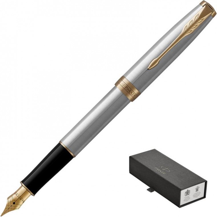 Ручка перьевая Parker Sonnet. Корпус сделан из нержавеющей стали. Декоративные детали дизайна покрыты позолотой 23К. Перо — сталь с позолотой 23К, толщина линии письма F. В комплект входит два черных картриджа и конвертер для заправки чернилами из флакона. Ручка перьевая поставляется в индивидуальном футляре.