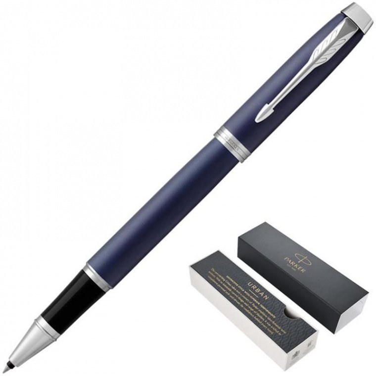 Ручка-роллер Parker IM из обновленной коллекции IM. Основные особенности нового дизайна: новый зажим-стрела с тремя широкими перьями, укороченная форма торца на колпачке, широкое кольцо на колпачке теперь состоит из 3 соединенных вместе колец, на среднем выполнена гравировка логотипа Parker. Корпус ручки-роллера выполнен из латуни и покрыт матовым лаковым покрытием темно-синего цвета, отдельные элементы дизайна покрыты хромом, зона захвата изготовлена из блестящего пластика. Ручка поставляется в престижной подарочной коробке с обновленным дизайном, в комплекте также присутствует один стержень черного цвета. Стержень расположен отдельно от ручки, под подложкой вместе с гарантийным талоном.