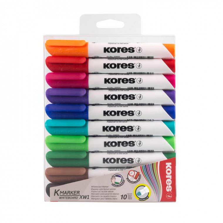 Набор маркеров для досок Kores 20800 Круглый наконечник. Маркеры на водной основе с содержанием спирта. Пластиковый корпус. Толщина линии письма — 3 мм Цвета: синий, чёрный, красный, зелёный, розовый, фиолетовый, бирюзовый, коричневый, салатовый и оранжевый. Стираются с таких гладких поверхностей, как пластик, стекло и эмаль, сухим способом. Снятый колпачок не потеряется благодаря тому, что во время работы его можно надевать на верхнюю часть маркера.