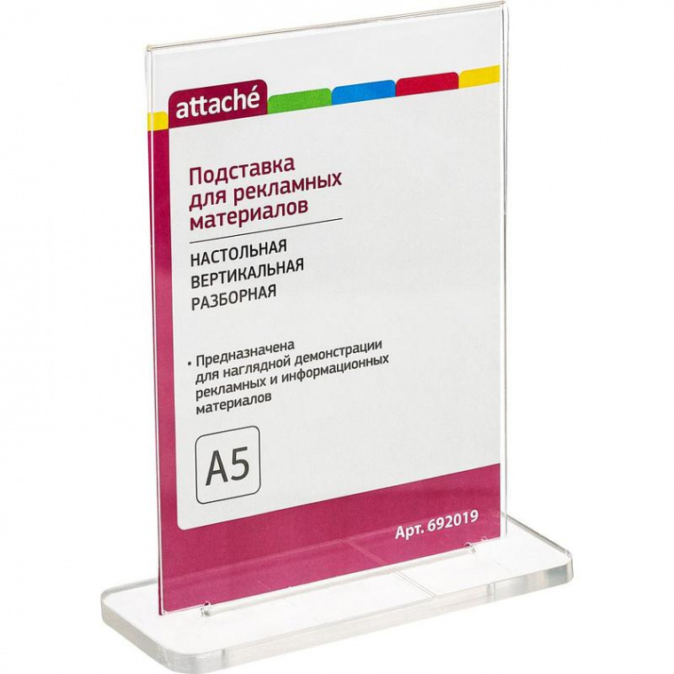 Вертикальная двухсторонняя настольная подставка под информацию Attache, разборная. Формат: А5 (210×150 мм). Основание выполнено из толстого, прозрачного акрила. Поставляются подставки в синей защитной пленке, перед применением, пленку необходимо снять. Чтобы вставить лист в подставку, нужно вынуть подставку из основания, вставить в нее лист и закрепить подставку обратно в основание. Размер (ВхШхГ): 210×150×70 мм.