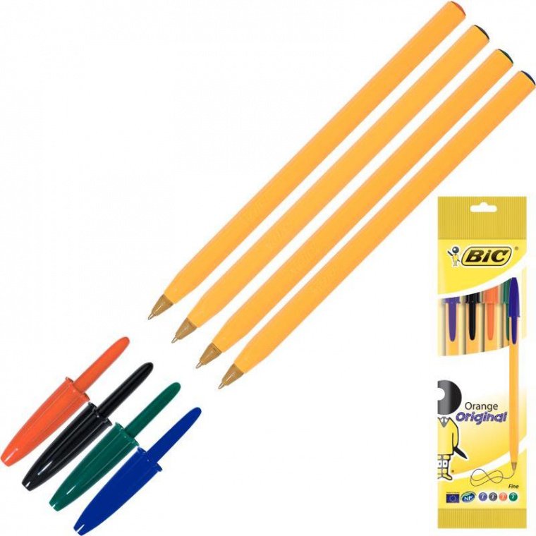 Набор одноразовых шариковых ручек BIC Orange. Выполнены в шестигранном оранжевом корпусе из пластика, снабжены вентилируемыми колпачками и наконечником в цвет чернил. В комплекте четыре ручки с чернилами синего, черного, зеленого и красного цветов. Цвет колпачка соответствует цвету чернил. Толщина линии письма 0,3 мм. Форма наконечника — стандартная. Товар имеет экологический сертификат NF Environment.