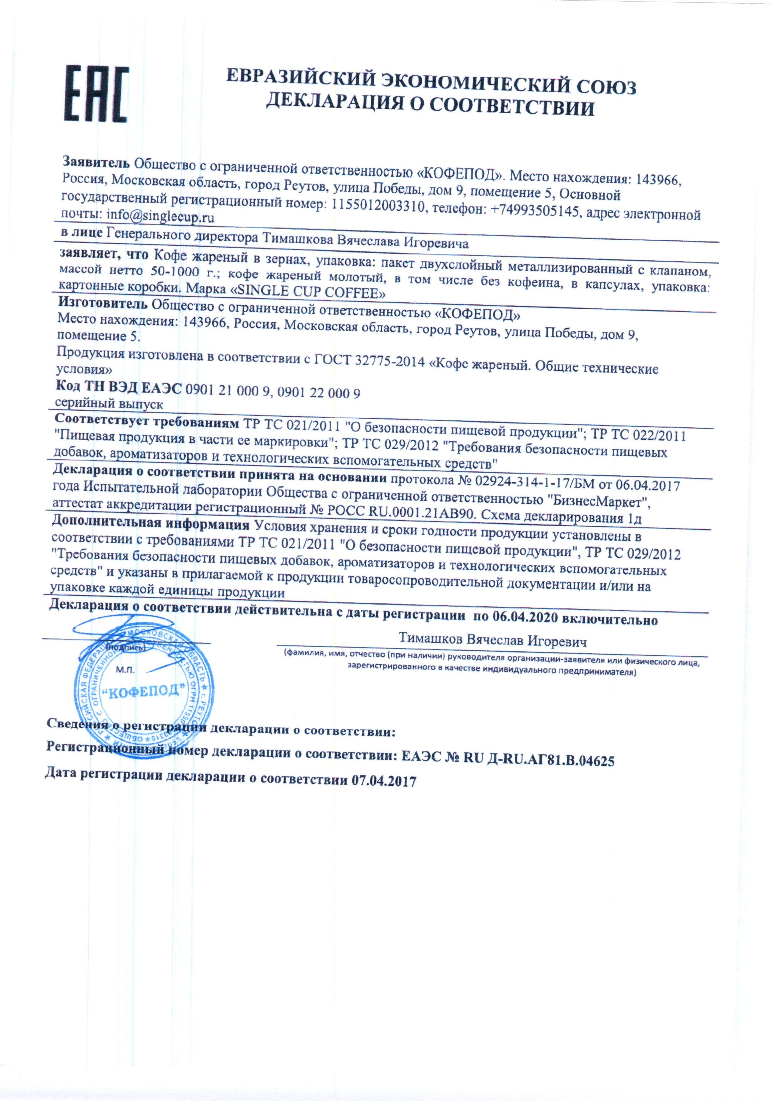 Состав: капсула с жареным молотым кофе, 100% арабика.
