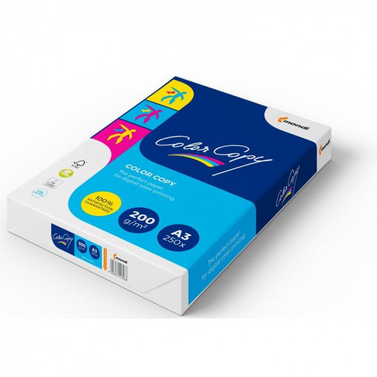 Бумага Color Copy формата А3 предназначена для печати на монохромных и цветных лазерных принтерах, на цветных копировальных аппаратах и на цифровых печатных устройствах. Плотность бумаги составляет 200 г/кв.м, толщина — 200 мкм, высокая степень белизны — 161%. Поверхность гладкая, с однородной структурой. Пачка содержит 250 листов.