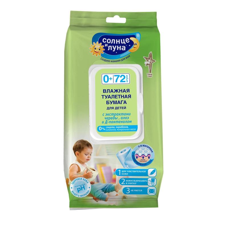 Бумага туалетная влажная детская Солнце и луна 72 листа в пачке