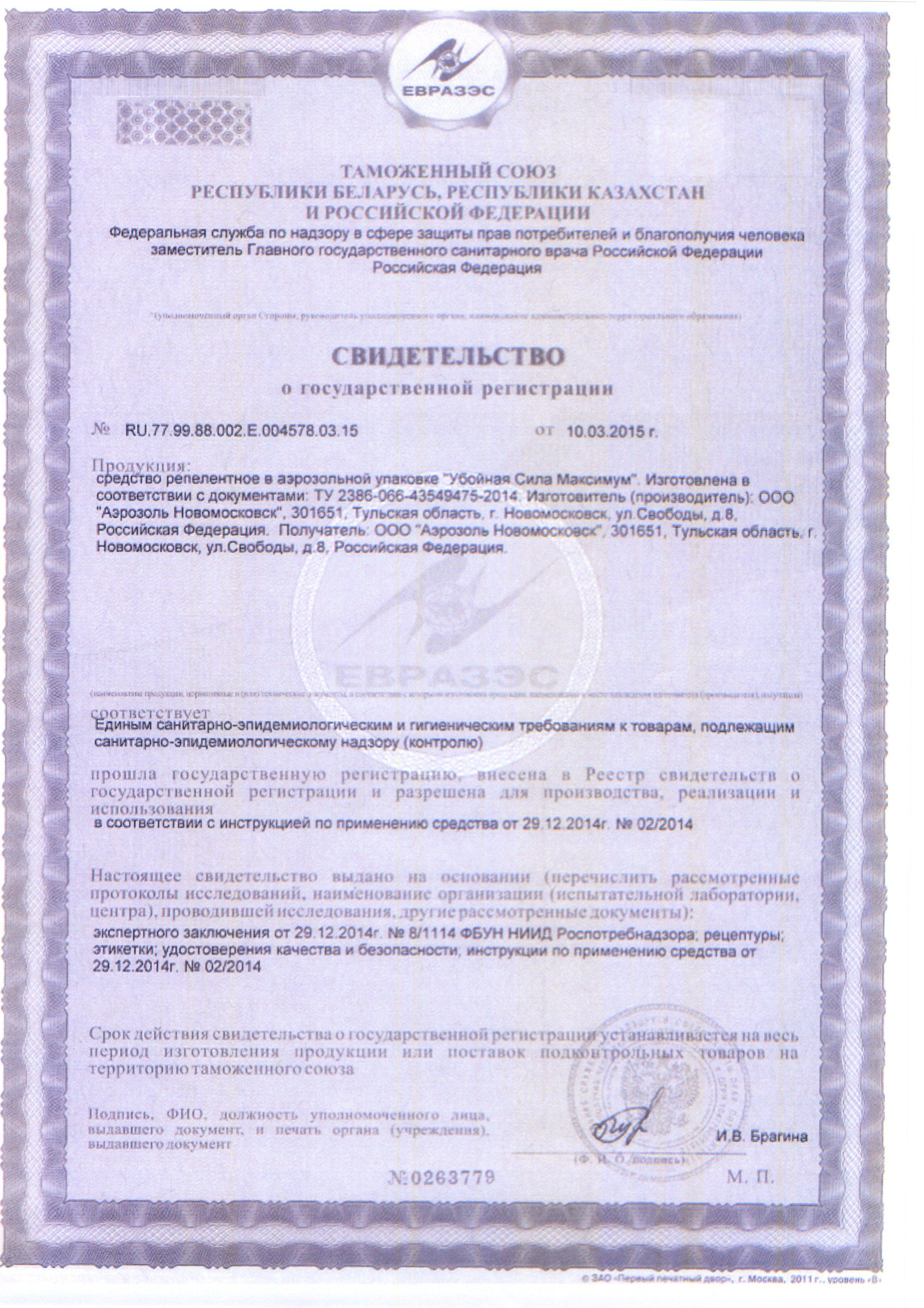 Сертификат на товар - Средство от комаров, клещей, мошки Убойная сила Maximum аэрозоль 150 мл