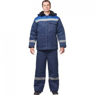 Спецодежда зимняя куртка мужская з32-КУ (размер 44-46, рост 170-176) темно-синего цвета с васильковой вставкой. Изготовлена из смесовой ткани (Тип 3) (80% полиэстер, 20% хлопок) плотностью 210 г/кв.м., с водоотталкивающей пропиткой. Такой материал обладает улучшенными эксплуатационными характеристиками, благодаря высокой плотности непроницаем для пыли, отличается высокой износостойкостью. Сохраняет яркий цвет. Утеплитель - синтепон, плотность утеплителя - 200 г/кв.м (2 слоя). Материал подкладки - 100% полиэстер. Светоотражающая полоса шириной 5 см размещена спереди и сзади между кокеткой и нижней частью куртки. Куртка прямого силуэта, удлиненная, с центральной бортовой супатной застежкой на 5 петель-пуговиц. Полочка отрезная по линии кокетки. Наличие двух нижних накладных карманов с косым срезом и наличие одного накладного нагрудного кармана с клапаном с двойной контрастной отстрочкой. Низ куртки обработан швом в подгибку с закрытым срезом. По линии талии настрочена кулиса со сквозным выходом наизнанку, регулируется шаровым фиксатором и шнуром. Спинка прямая, отрезная по линии кокетки. Рукав прямой, втачной, одношовный. Внутри рукава по нижней части на подкладку притачан трикотажный манжет. Воротник меховой, спереди застегивающийся на пуговицу. Капюшон отстегивается. Куртка предназначена для защиты работающих от пониженных температур в различных отраслях промышленности, а также производственных загрязнений. Изготавливается в соответствии с ГОСТ 12. 4. 303-2016. Рекомендуется для использования в ЖКХ, озеленении территории, строительстве, проведении ремонтных работ, промышленности, логистике, сельском хозяйстве. Коллекция зимней спецодежды з32 представлена в двух видах ткани - смесовая с влагоотталкивающей пропиткой и Оксфорд. Куртки из коллекции предлагаются в двух цветовых решениях: синий с отделкой василькового цвета и синий с отделкой яркого оранжевого цвета. К куртке з32-КУ из смесовой ткани подходят брюки з32-БР синего цвета из аналогичной ткани.