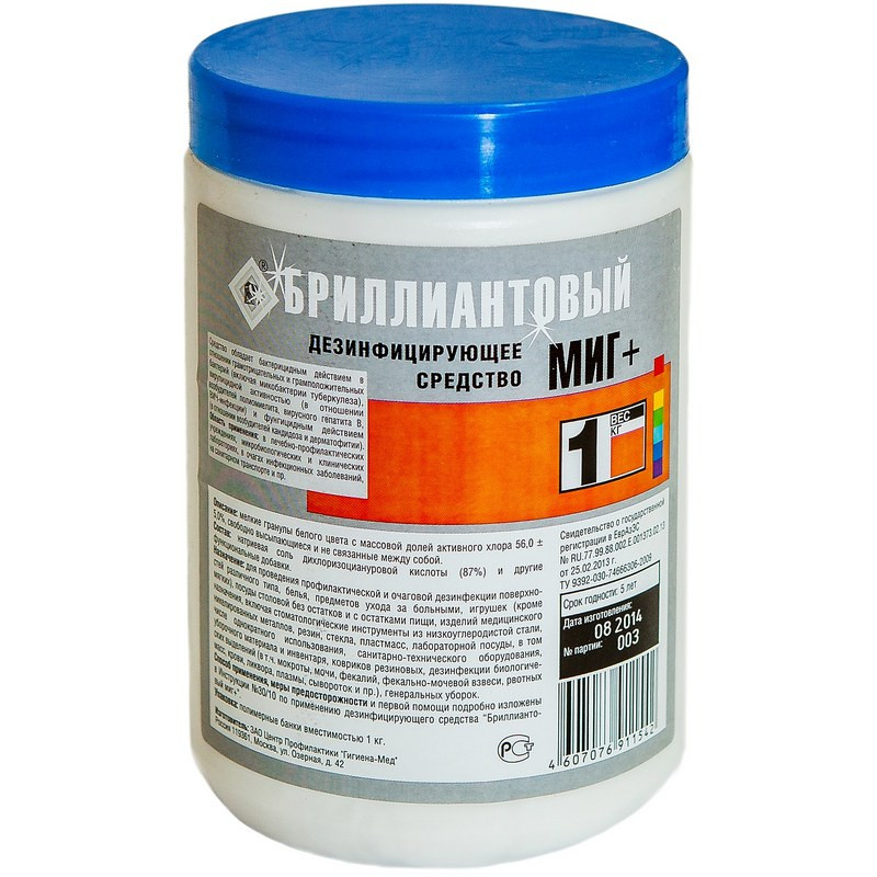 Хлорный порошок 'Бриллиантовый Миг Плюс'. Области применения: дезинфекция посуды, дезинфекция отходов, дезинфекция белья, дезинфекция поверхностей. Форма выпуска: гранулы. Способ применения: для дезинфекции выделений, засыпка, для профилактической и очаговой дезинфекции, генеральных уборок и т. п., протирание, замачивание. Состав активно-действующих веществ (АДВ): натриевая соль дихлоризоциануровой кислоты 87% (56+5 % активного хлора). Антимикробная активность: эффективен в отношении бактериальной флоры (включая туберкулез), вирусных инфекций (включая гепатиты (А, Б, С), ВИЧ, полиомиелит) и патогенных грибов. Сфера применения: медицинские учреждения, лаборатории, санитарный транспорт, очаги инфекционных заболеваний. Показания к применению: дезинфекция биологических выделений и жидкостей, в т. ч. мокроты, мочи, фекалий, фекально-мочевой взвеси, рвотных масс, крови, ликвора, плазмы, сывороток и прочих, профилактическая и очаговая дезинфекция поверхностей, белья, предметы ухода, игрушки, посуда, изделия медицинского назначения, лабораторная посуда и прочих. Нормы расхода: - для дезинфекции мочи: 5 г средства на 1 л выделений с экспозицией 60 минут; - для дезинфекции фекально-мочевой взвеси: 50 г средства на 1 л выделений с экспозицией 120 минут или 100 г средства на 1 л выделений с экспозицией 60 минут; - для дезинфекции рвотных масс: 50 г средства на 1 л выделений с экспозицией 120 минут или 100 г средства на 1 л выделений с экспозицией 60 минут; - для дезинфекции различных объектов, в т. ч. при проведении генеральных уборок: от 2,7 до 53,6 г средства на 10 л рабочего раствора. Токсичность: малотоксично, 3-4 класс опасности. его раствора в зависимости от этиологии возбудителя и экспозиции. Срок годности средства: 5 лет, рабочих растворов - 3 суток. Упаковка: пластмассовая банка с ложечкой дозатором.
