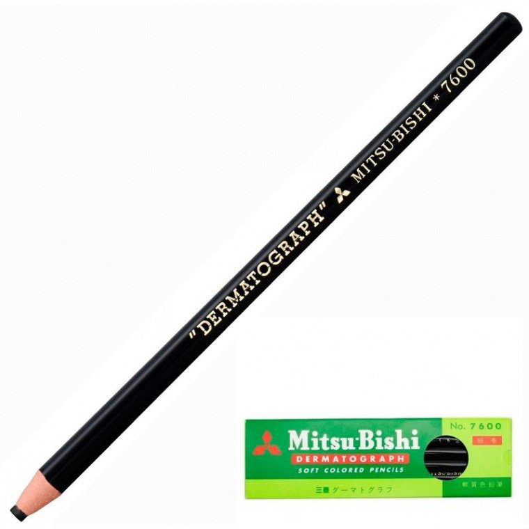 Восковой карандаш Uni Dermatograph черного цвета, который не требует заточки. Карандаш пишет практически на всех видах поверхностей: стекло, металл, керамика, пластик и кожа. Имеет широкую область применения: для маркировки изделий, нанесения разметки, подписей, декорирования посуду, нанесения узоров и прочее. При температуре +40 С грифель расплавляется. Толщина линии: 1,0 — 4,4 мм.