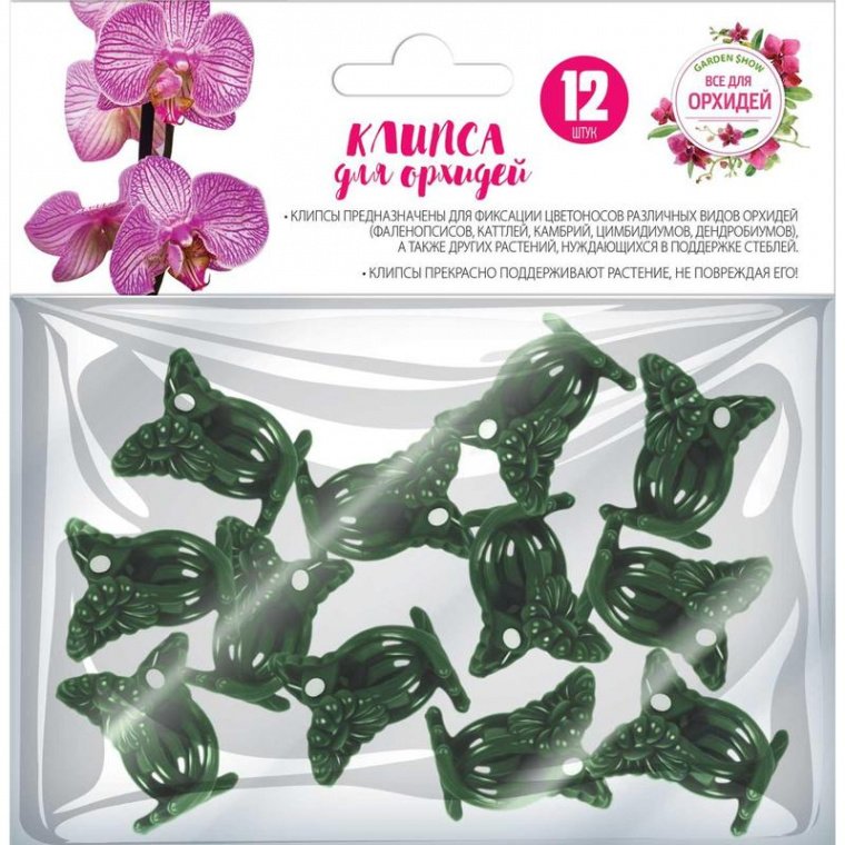 Зажимы для орхидей Garden Show предназначены для фиксации стеблей и цветоноса растения к опоре. Идеальны для орхидей и других комнатных растений. Материал: пластмасса. В наборе: 12 штук. Цвет: зеленый. Размер одного зажима: 12×20 мм.