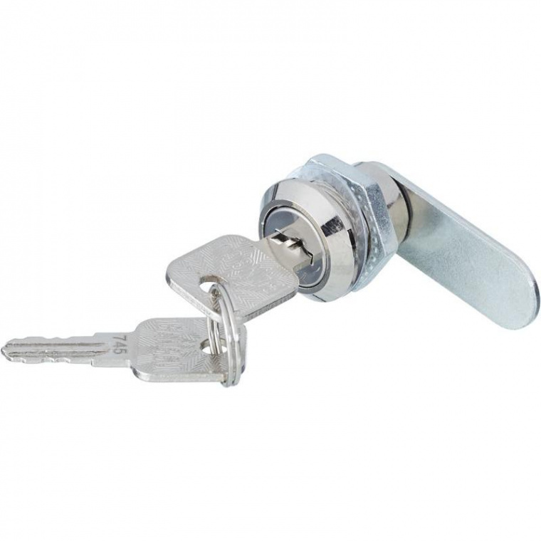 Размеры замка: диаметр по резьбе — 17,5 мм, диаметр по фаскам — 16 мм, высота (длина корпуса) — 20 мм, поворот ригеля — 90 градусов, ригель прямой, Крепление ригеля — винт. Длина резьбы 16 мм. В комплекте: гайка, шайба, два ключа.