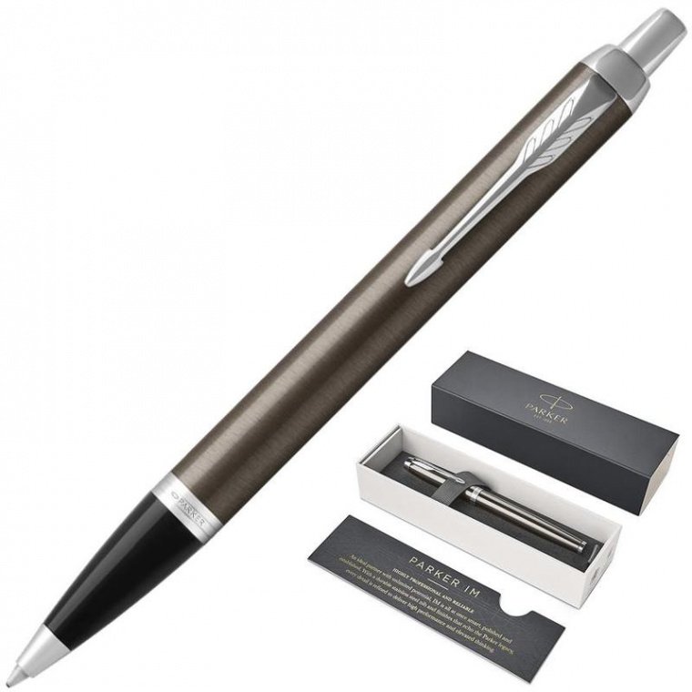 Ручка шариковая Parker IM Metal Core Dark Espresso. Parker IM выражение высокого классического стиля в новых отделках с нежной текстурой. Совершенный баланс между современным дизайном, оптимальной функциональностью, традицией и современностью. Полировнный латунный корпус светло-коричневого оттенка сужается в зоне захвата, покрытой черным лаком. Зажим в форме стрелы. Ручка позволяет писать без нажима, линии получаются гладкими и чистыми. Толщина линии письма — 0,8 мм.