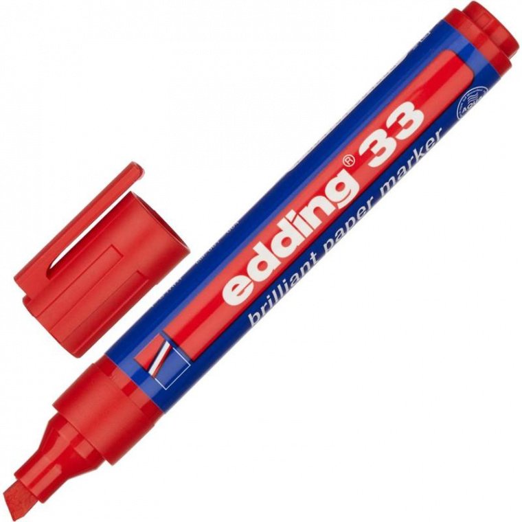 Пигментный маркер в пластиковом корпусе. Клиновидный наконечник обеспечивает толщину линии от 1 до 5 мм. Цвет — красный.