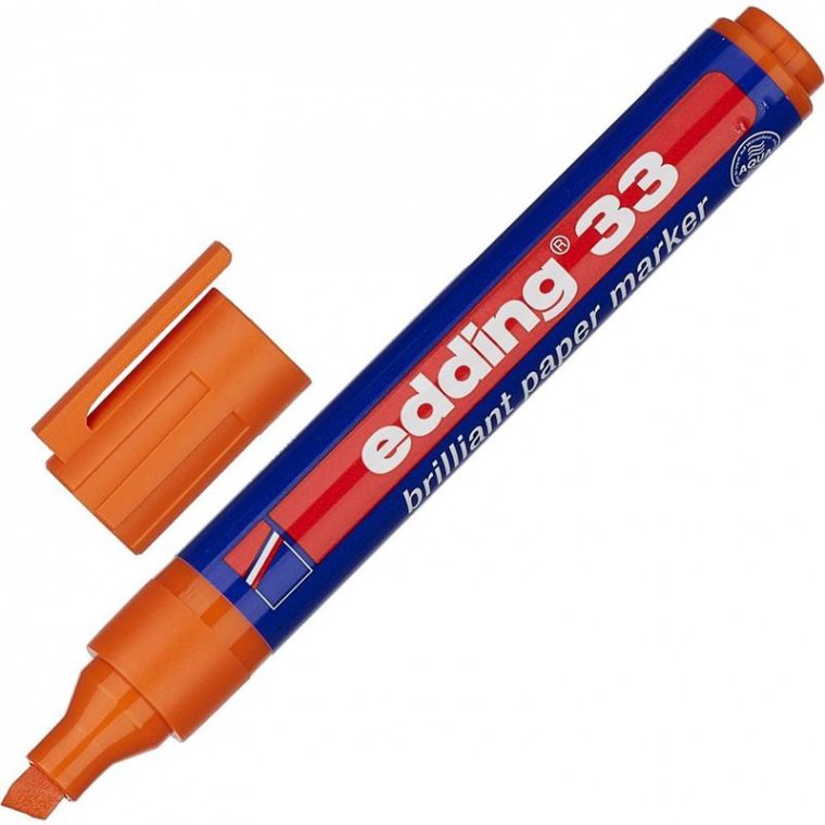 Пигментный маркер в пластиковом корпусе. Клиновидный наконечник обеспечивает толщину линии от 1 до 5 мм. Цвет — оранжевый.