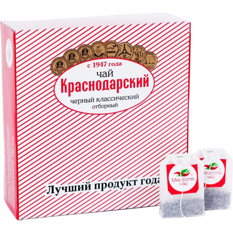 Чай «Краснодарский с 1947 года» черный отборный 100 пакетиков — это прекрасный чай, рожденный на высокогорных плантациях города Сочи, где теплый климат и ласковое солнце дарят ему великолепные характеристики вкуса, аромата и насыщают огромной пользой. Этот замечательный купаж является неоднократным победителем в номинации «Лучший продукт года», что позволяет гордиться отечественным производством и наслаждаться натуральным вкусом качественного чая. Стоит отметить, что продукция чайной компании входит в Британскую гильдию лучших продуктов мира, а также выпускается под контролем европейских лабораторий ICEA и является обладателем органического сертификата.