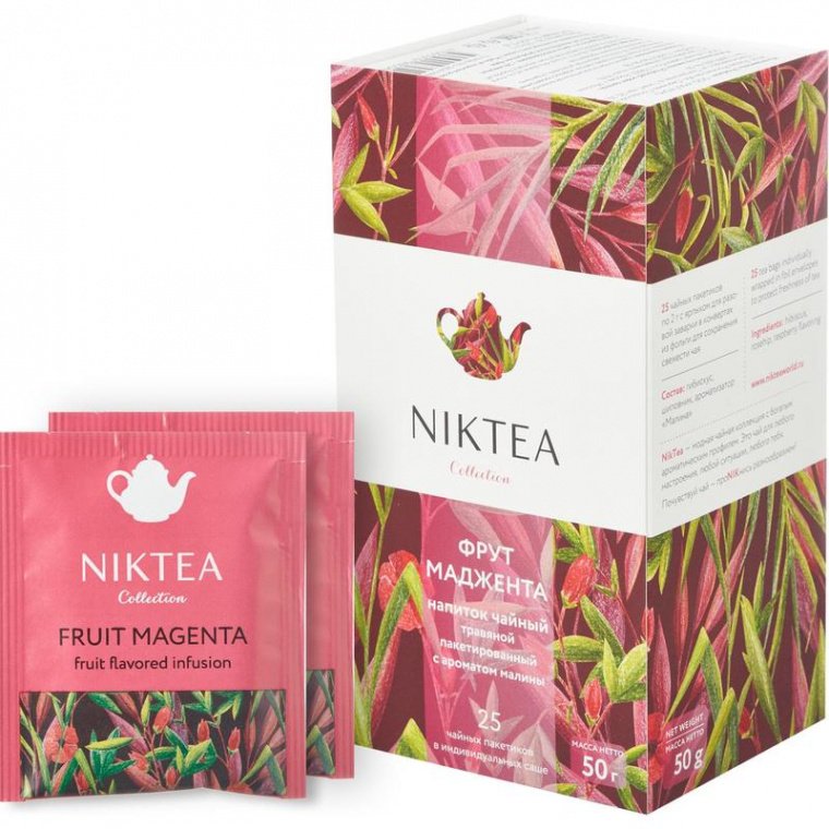 Чай NikTea Фрут Маджента фруктовый с ароматом малины 25 пакетиков — это нежно-розовый букет из великолепных цветков гибискуса и ярких плодов шиповника с утонченным вкусом и ароматом сочной малины. Сладкий, воздушный десертный напиток прекрасно подходит для неспешных чаепитий и сопровождения любимых угощений. Летний настой поможет утолить жажду, расслабиться, успокоить мысли и настроиться на позитивный лад.