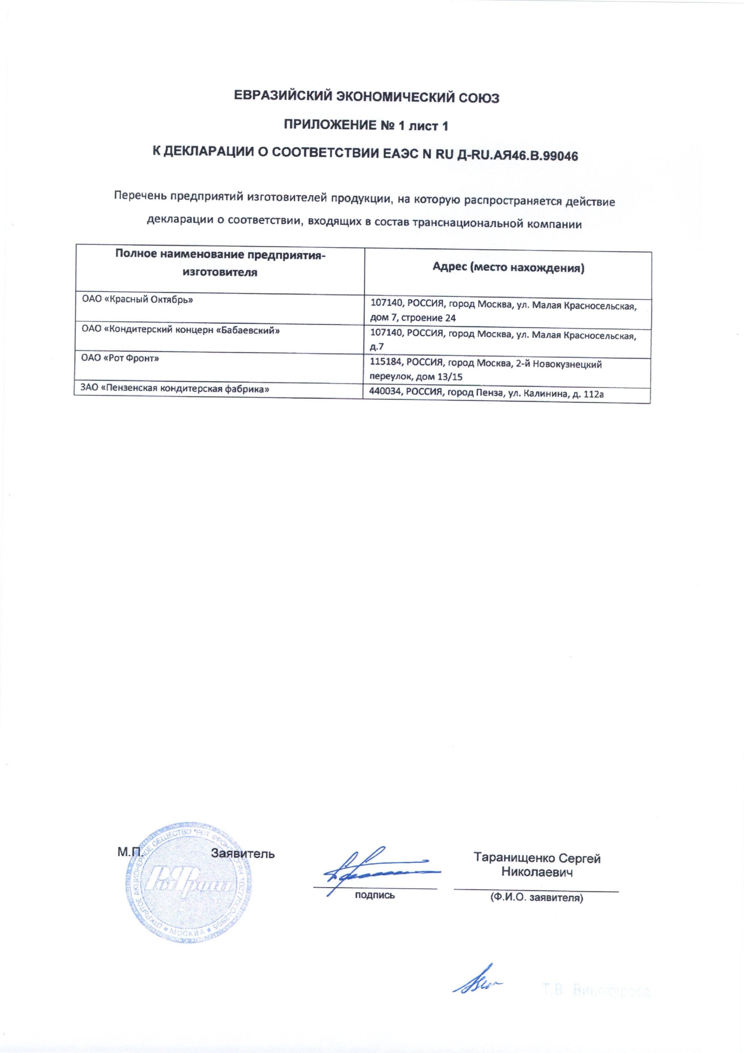 Состав: шоколадная глазурь (сахар, какао тертое, эквивалент масла какао (рафинированные, дезодорированные, фракционированные, негидрогенизированные растительные масла (пальмовое, ши)), какао-порошок, эмульгаторы: лецитин соевый, Е476, ароматизатор «Ваниль»), сахар, ядро ореха миндаля тертое, масло какао, вафли (вода питьевая, мука пшеничная хлебопекарная высшего сорта, масло подсолнечное рафинированное дезодорированное, соль, эмульгатор лецитин соевый, разрыхлитель гидрокарбонат натрия), антиокислитель аскорбиновая кислота, альфа-Токоферол, ароматизатор «Ваниль».