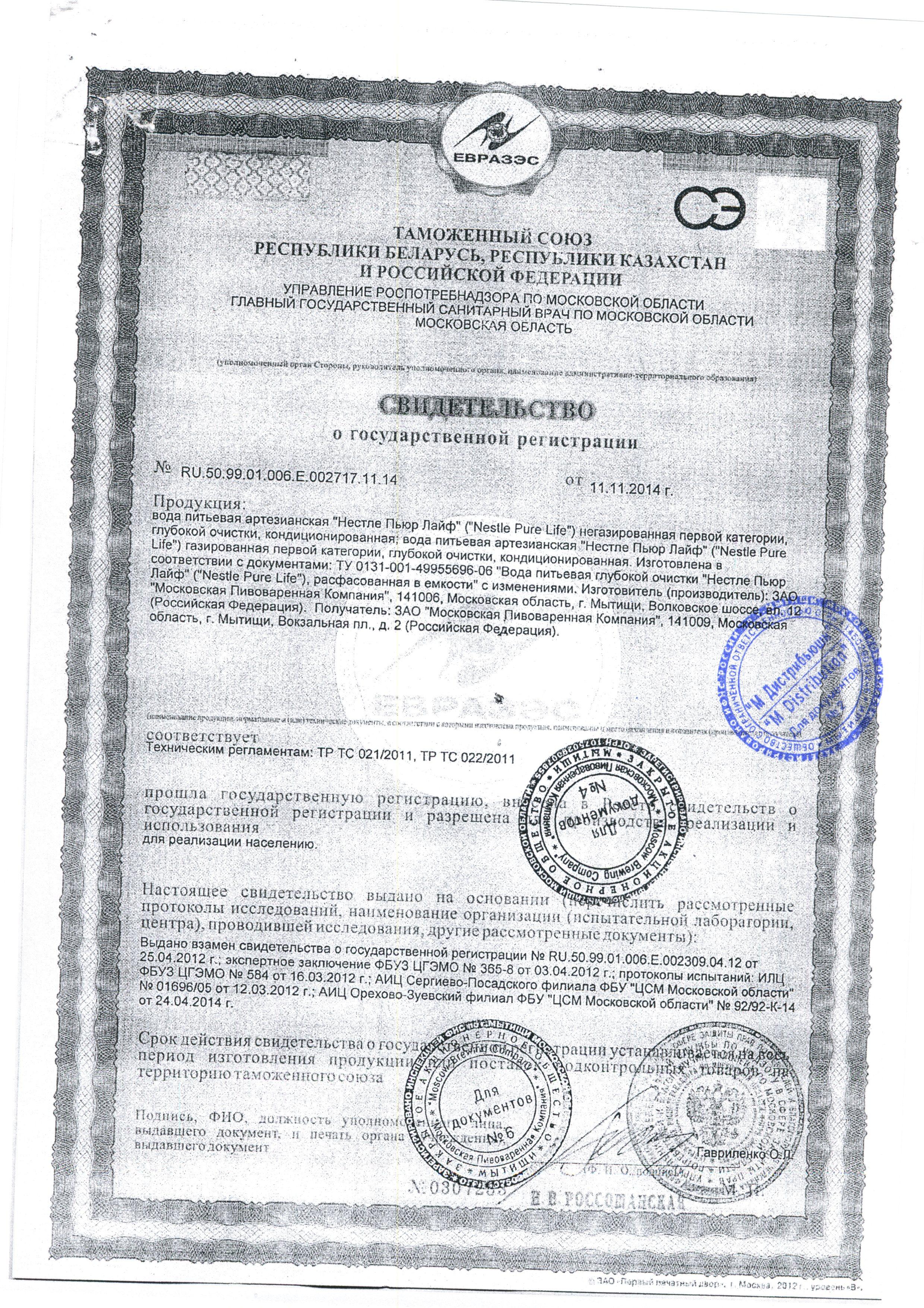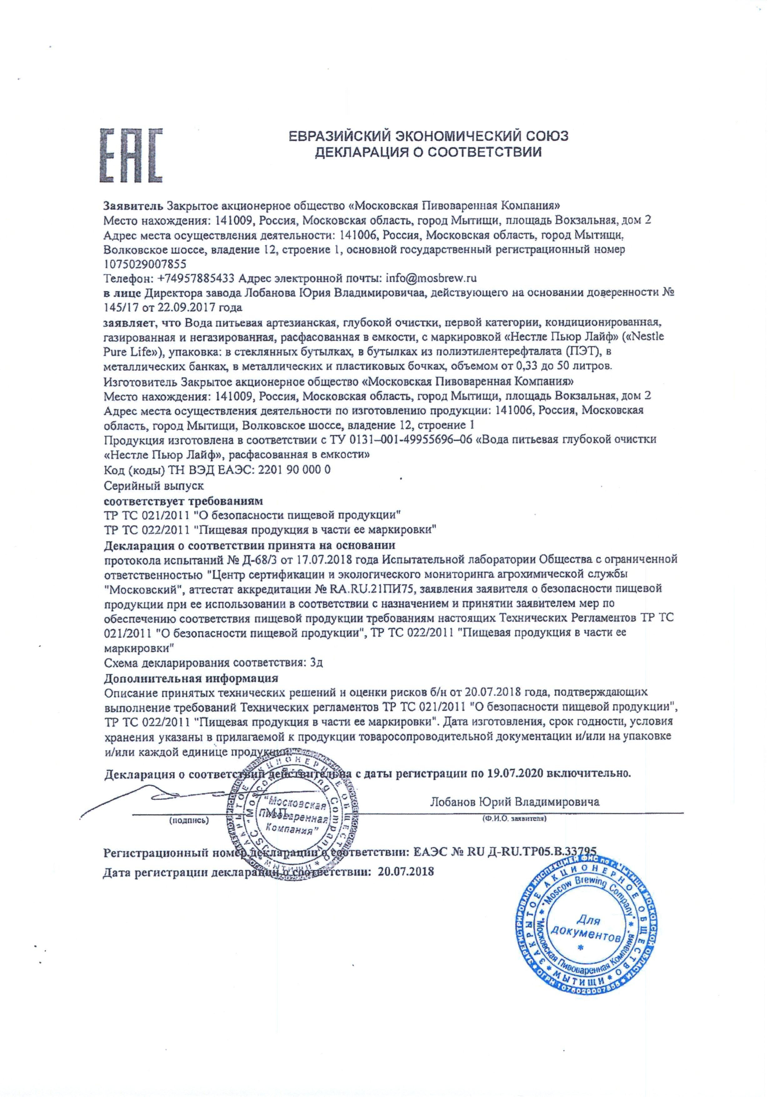Сертификат на товар - Вода питьевая Nestle Pure Life негазированная 0.5 л (12 штук в упаковке)