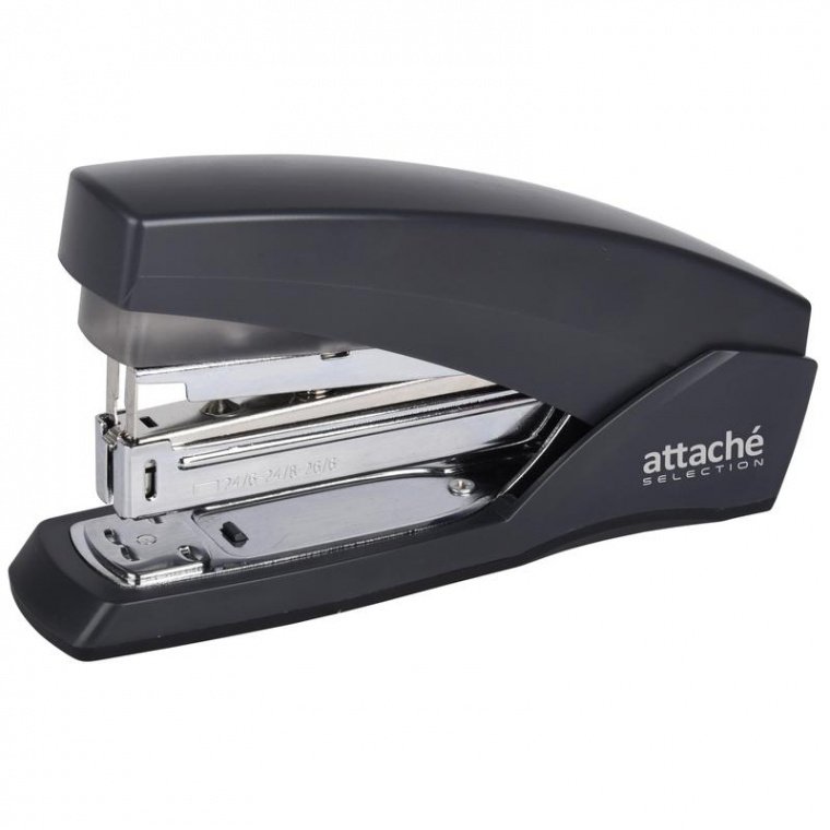 Степлер Attache Selection Brook одновременно сшивает до 50 листов плотностью 80 г/кв. м. Оснащен функцией закрытого и открытого сшивания. Глубина закладки бумаги — 70 мм (7 см). Благодаря технологии Less Effort при сшивании прилагается до 60% меньше усилий. Корпус выполнен из пластика цвета графит. В степлере используются скобы 24/6, 26/6, 23/8. Вместимость скоб № 24/6 — 110 штук.