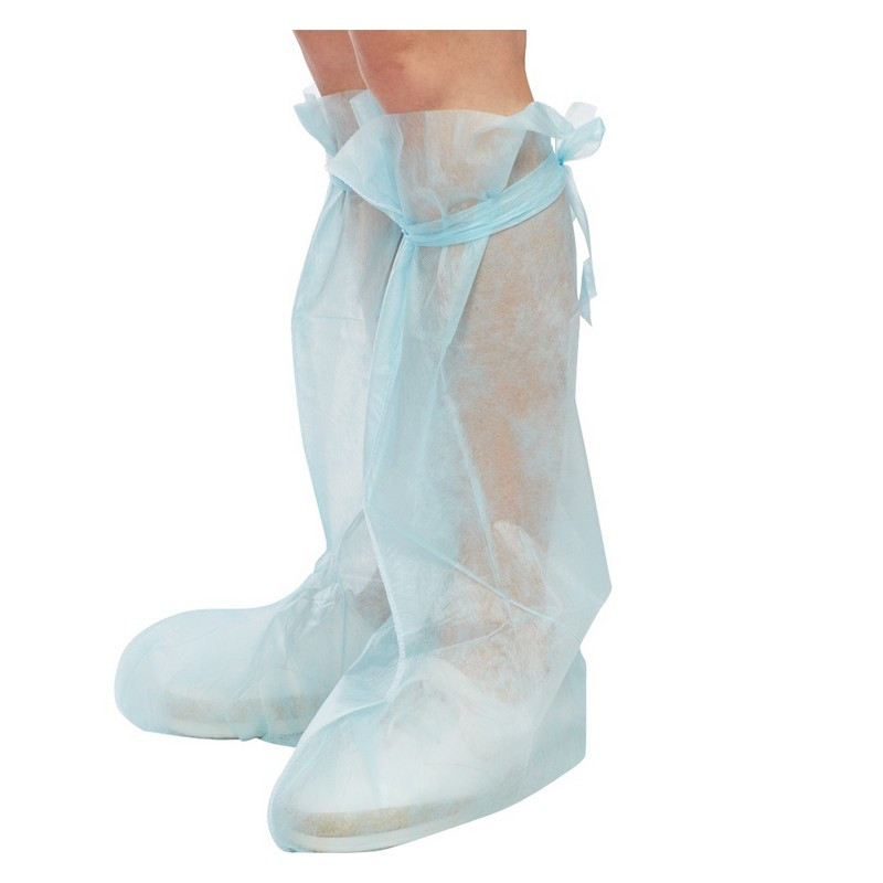 Бахилы хирургические высокие на завязках одноразовые. Высота 65 см., длина стопы 40 см., длина завязок - 60 см. Шов наружный сварной (безниточный). Изготовлены из полипропиленового нетканого материала плотностью 42 г/м2, обладающего водоотталкивающими свойствами, воздухопроницаемостью и пониженным ворсоотделением. Не скользят по кафельному покрытию пола. Групповая упаковка в полиэтиленовый пакет. Нестерильно. Срок годности 4 года.
