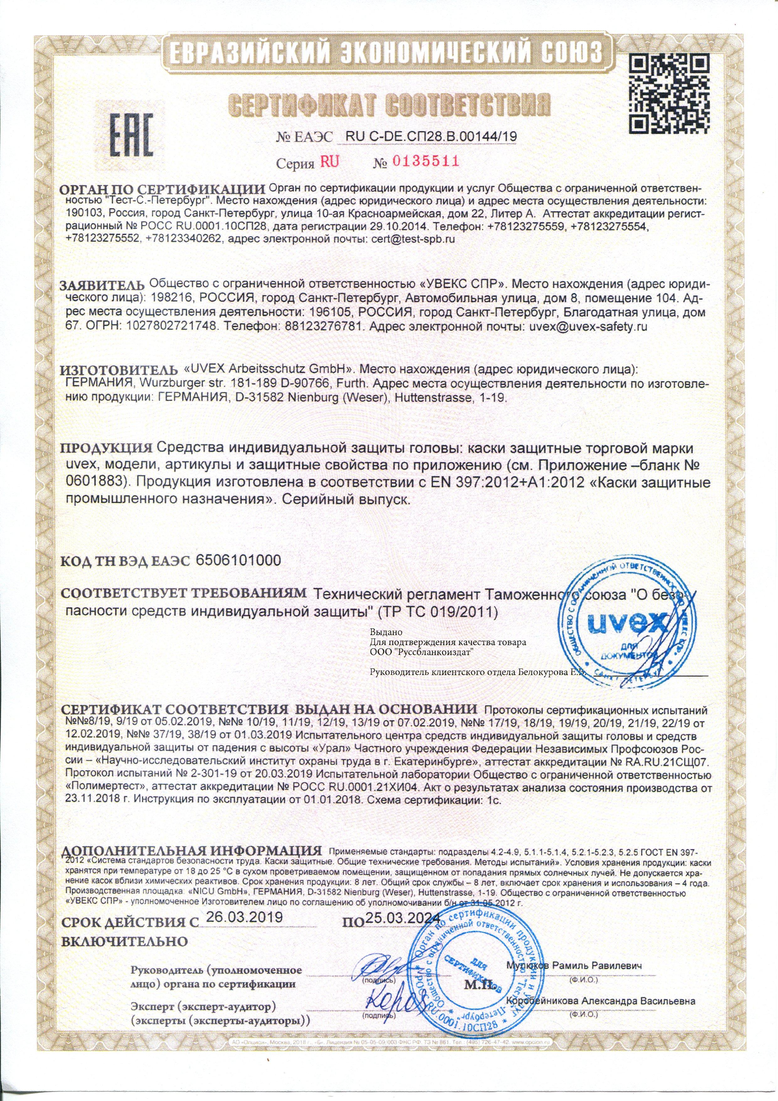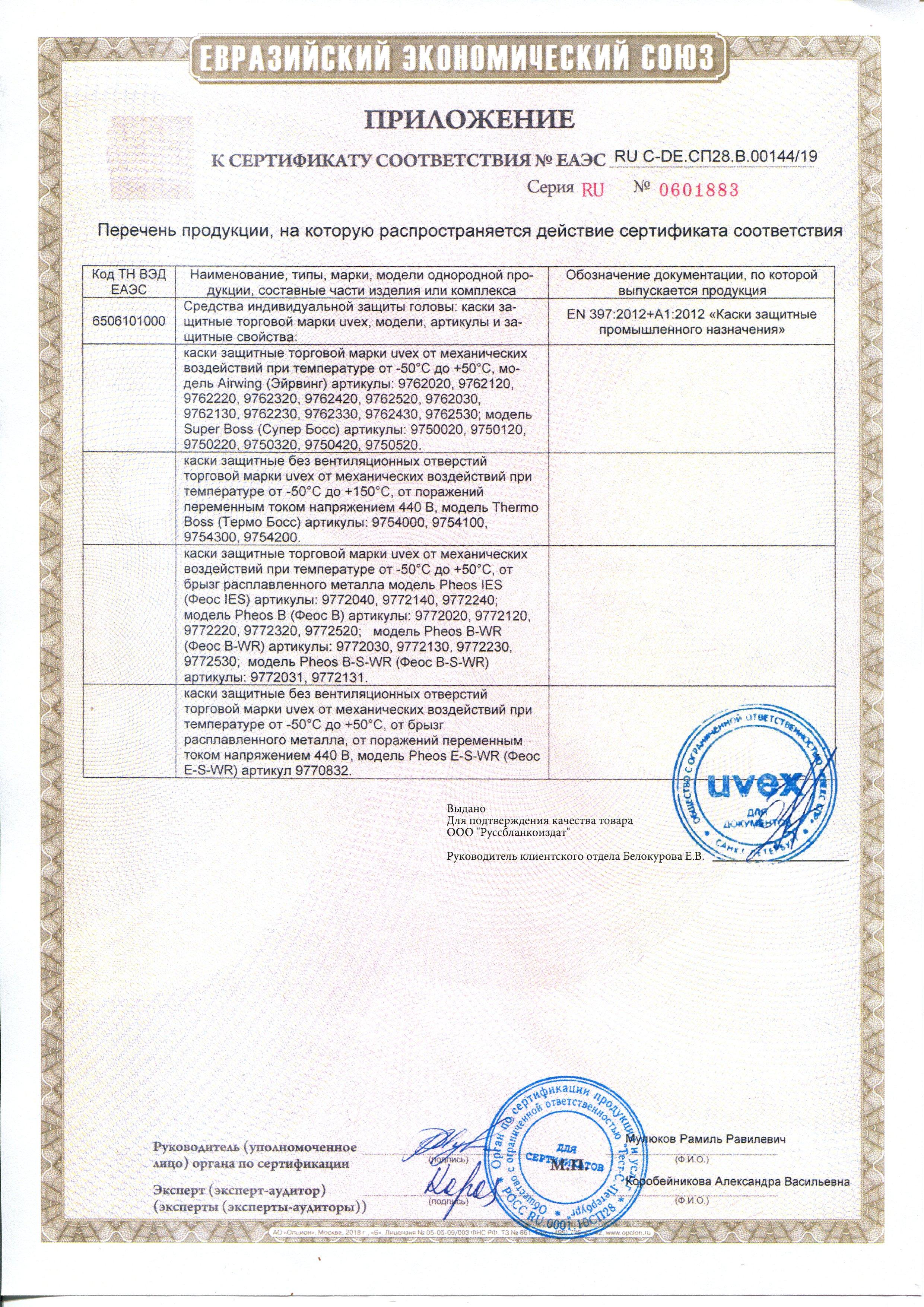 Сертификат на товар - Каска Uvex Эйрвинг белая (артикул производителя 9762.030)