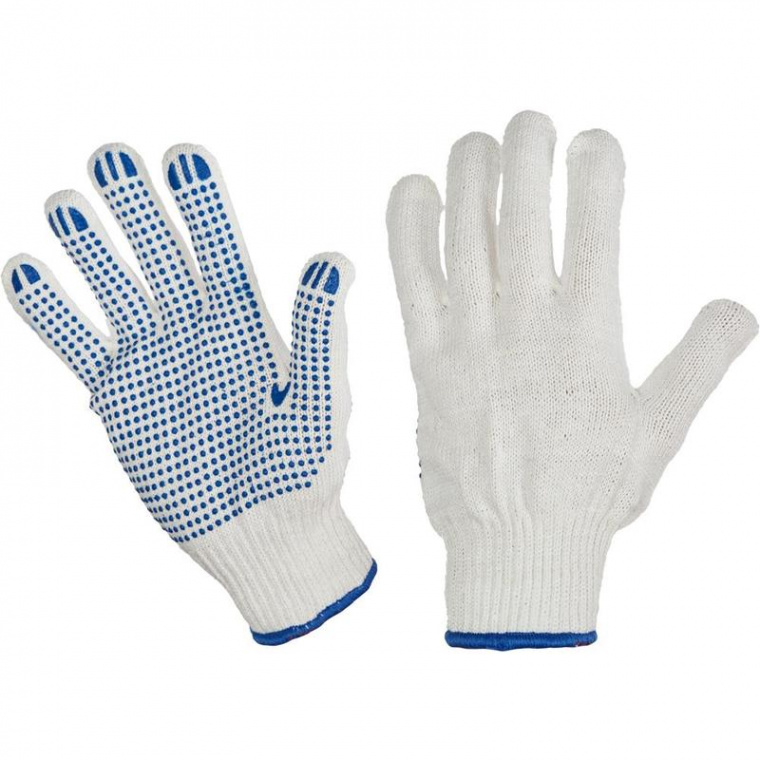 Трикотажные перчатки хб с покрытием ПВХ для защиты рук от механических повреждений (порезов и истираний) и общих производственных загрязнений. Рабочие перчатки изготовлены из хлопчатобумажной пряжи с покрытием из поливинилхлорида с нанесением рисунка на тыльную часть перчатки. Покрытие ПВХ помогает обеспечить плотный захват и предотвращает соскальзывание детали. Рабочие перчатки оптимальны для складских, садовых и ремонтных работ. Положите их в автомобиль и, в случае необходимости, вы защитите свои руки от травм и грязи. Основа: 60% хлопок, 40% полиэфир; вес пряжи — 166 текс. Покрытие: ПВХ, точка. Количество пар в упаковке: 10.