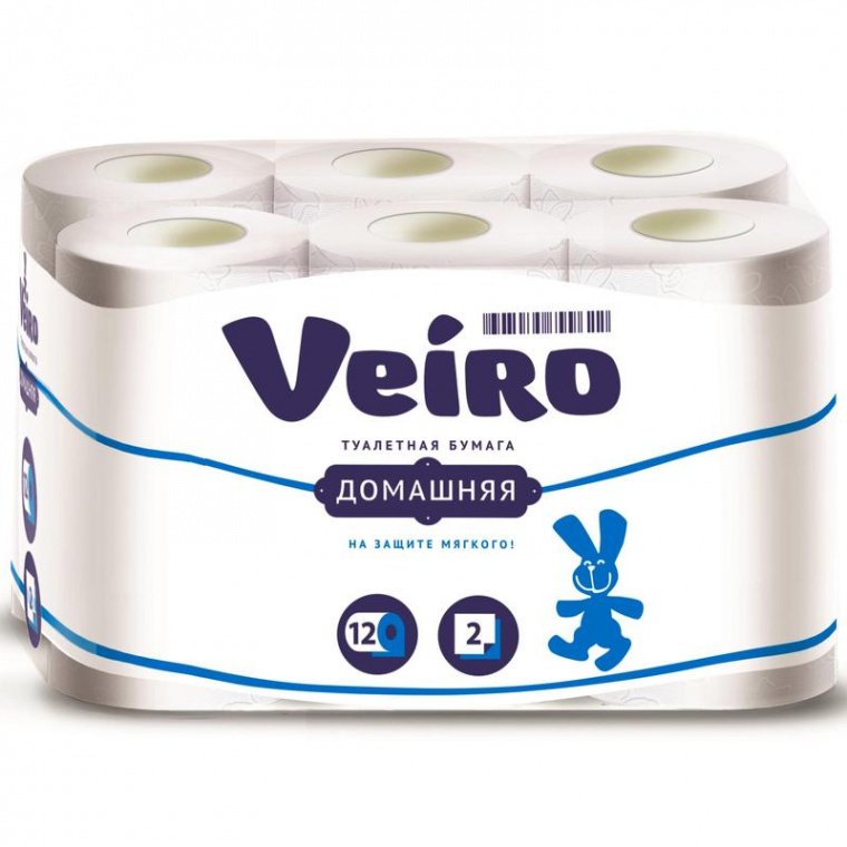Мягкая двухслойная белая туалетная бумага Veiro Домашняя с тиснением и перфорацией. Быстро растворяется в воде. В упаковке 4 рулона по 15 метров. В каждом рулоне — 120 листов размером 9.5×12.5 см.