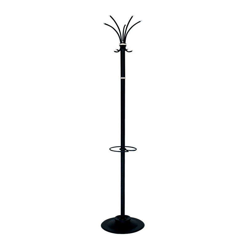 Напольная вешалка высотой 181 см выполнена из металла, состоит из круглого основания диаметром 40 см и штанги-стойки. Цвет - черный, стальные декоративные элементы. Не занимает много места, подходит для дома и офиса. В верхней части расположены крючки и рожки для предметов одежды и головных уборов. Есть держатель для зонтов-тростей. Нагрузка на верхний крючок для головных уборов - 1 кг. Нагрузка на нижний крючок для одежды - 5 кг. Максимальная распределенная нагрузка на вешалку - 20 кг.Изображения товаров на сайте не могут гарантировать точную цветопередачу.