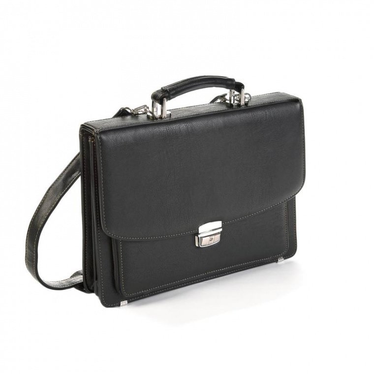Портфель Директ 131/2 выполнен из искусственной кожи черного цвета. Портфель закрывается на клапан на замке. Внутри расположены два основных отделения с карманом-перегородкой, система карманов для мелких документов и держатели для ручек. Кроме того, портфель оснащен объемным карманом на передней стенке, металлическими ножками и съемным плечевым ремнем с наплечником.