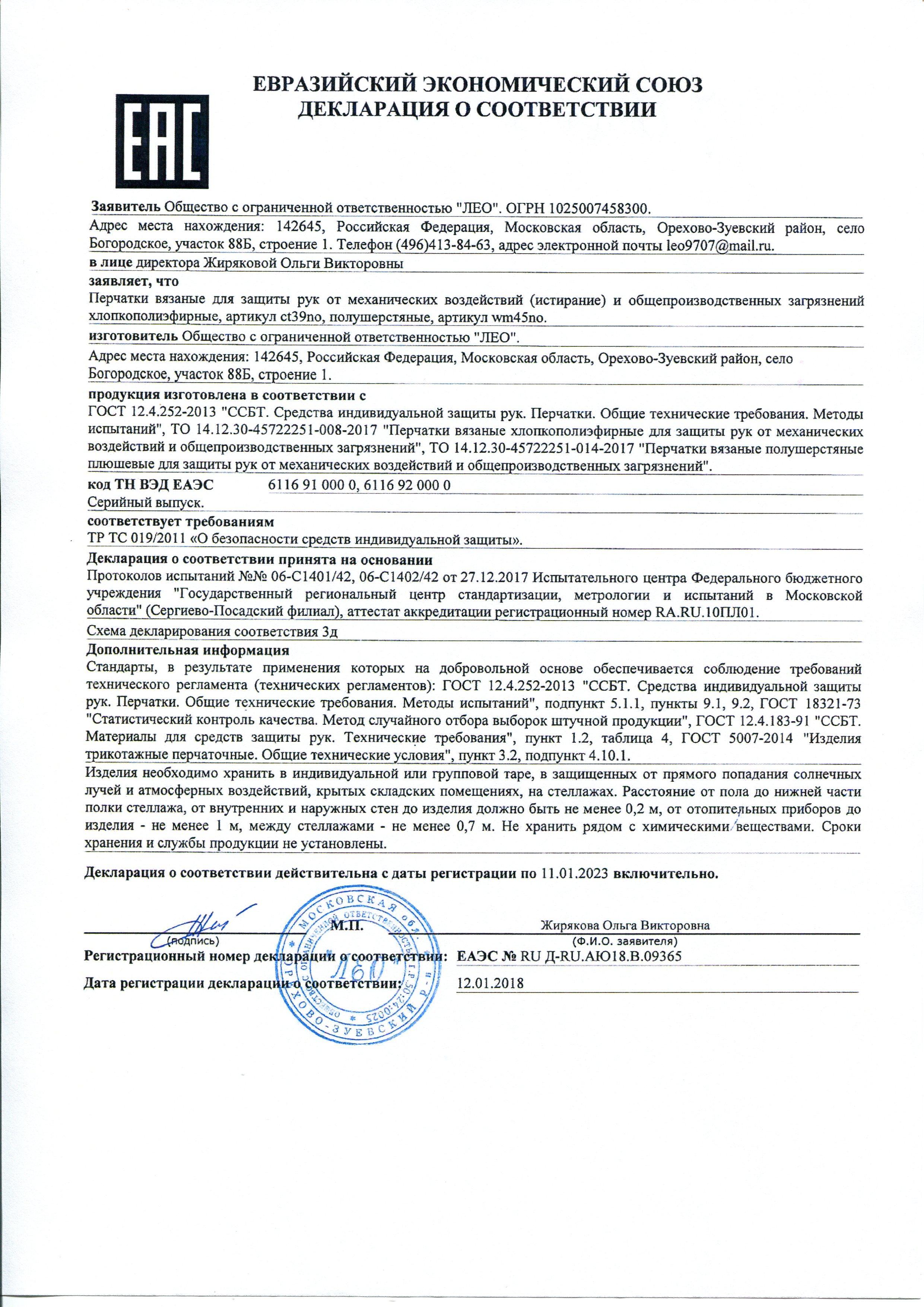 Сертификат на товар - Перчатки рабочие трикотажные 13 класс 38 г (10 пар в упаковке, ручной оверлок)