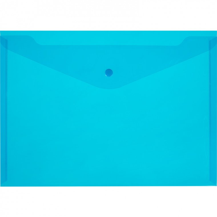 Папка-конверт формата А4 изготовлена из прозрачного пластика толщиной 0,18 мм синего цвета. Закрывается на кнопку. Удобна для хранения и переноски документов, предотвращает их смятие и загрязнение. Вмещает до 120 листов стандартной плотности.