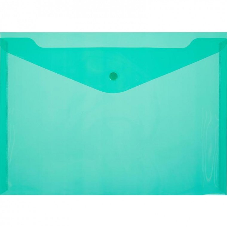 Папка-конверт формата А4 изготовлена из прозрачного пластика толщиной 0,18 мм зеленого цвета. Внешний размер: 328×240 мм. Закрывается на кнопку. Удобна для хранения и переноски документов, предотвращает их смятие и загрязнение. Вмещает до 120 листов стандартной плотности.
