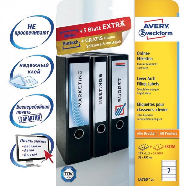 Этикетки бумажные самоклеящиеся Avery Zweckform — решение для маркировки папок-регистраторов. Имеют прямоугольную форму, закругленные края. Подходят для печати на лазерных и струйных принтерах. В упаковке 25 листов по 7 этикеток размером 192×38 мм. Цвет белый.