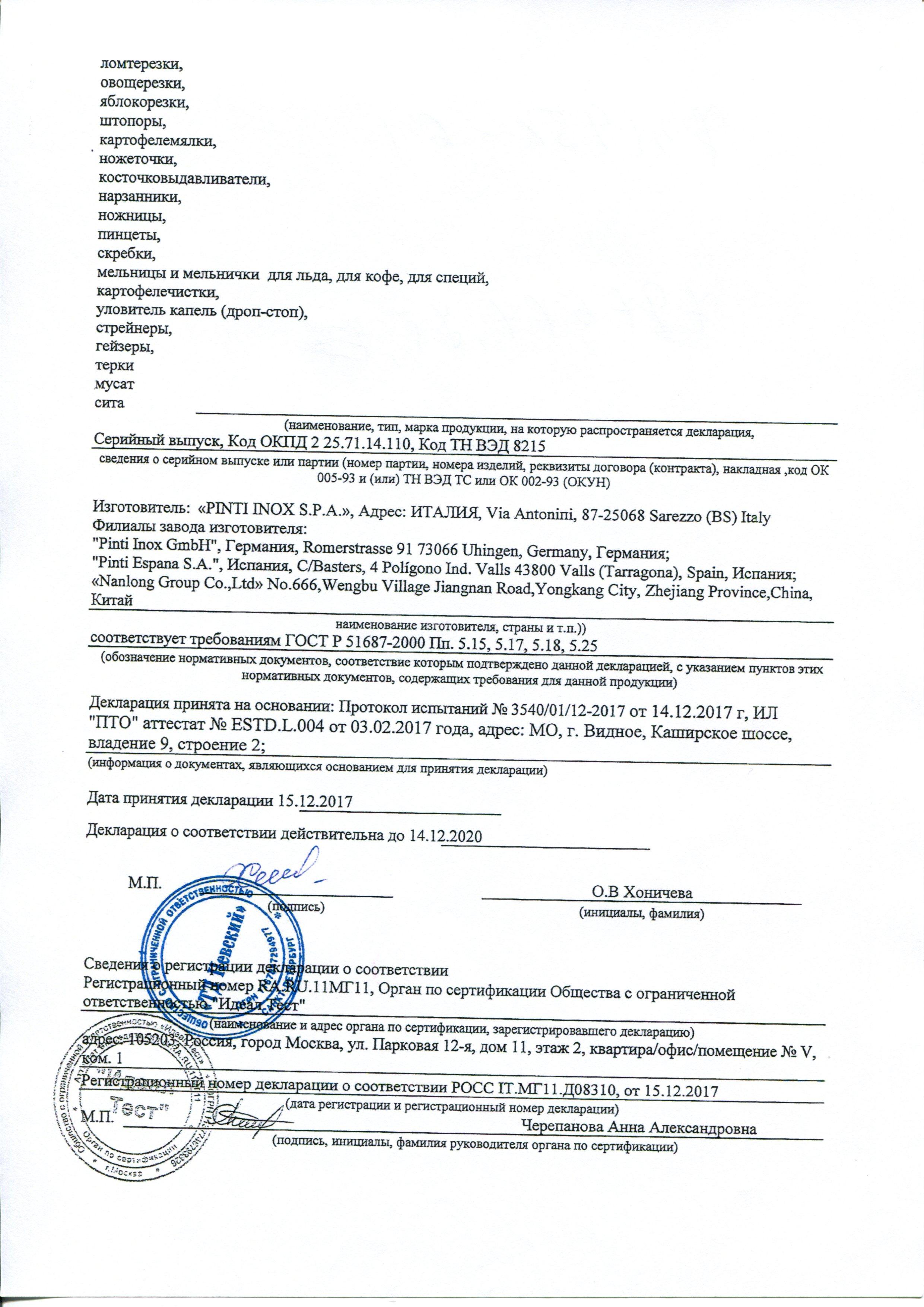 Сертификат на товар - Нож столовый Pintinox Бостон 21.3 см 12 штук в упаковке (артикул производителя 1260M0L3)